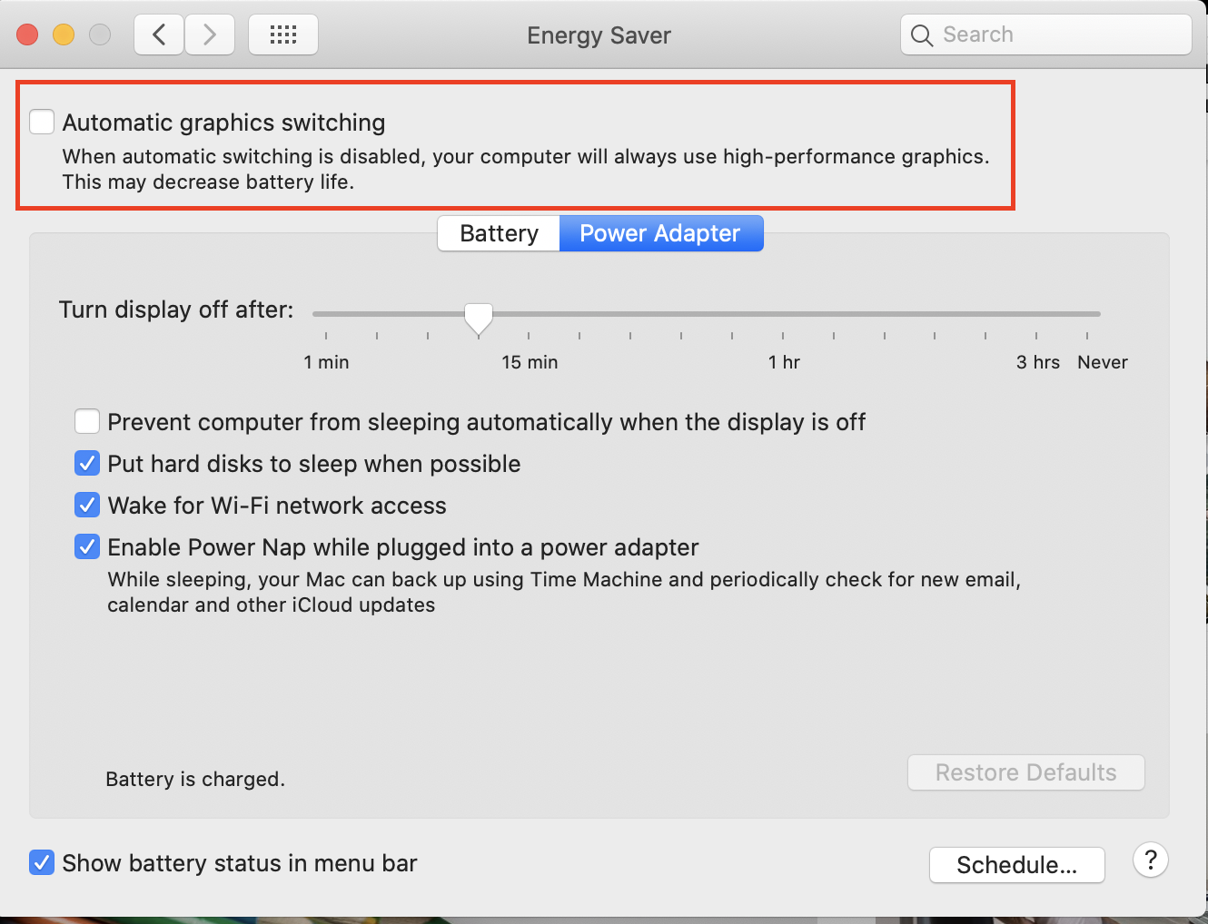 - If your Macbook has independent graphic card or external graphic card, you can go to System Preferences -> Energy Saver to uncheck Automatic graphics switching.