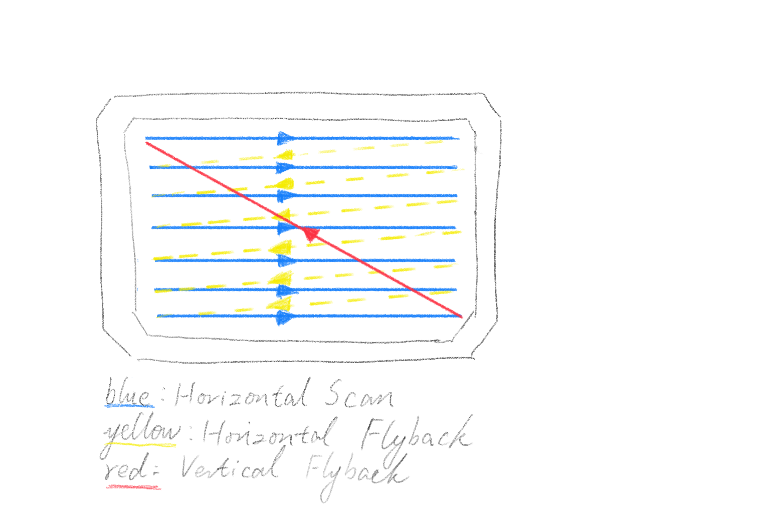 There is an electron gun in a CRT monitors. The gun doesn’t scan it randomly but in a designed fashion. The above figure shows the way. Firstly, it scans from left to right, when the beam reaches the right-hand side of the screen it undergoes a process aka horizontal flyback. While the beam is flying back, it is also pulled a little way down the screen. The gun keeps on repeat this process until the beam reaches the bottom-right side. While this process finishes, a frame of picture is represented on the screen. Then it flies back the initial position for next scan.