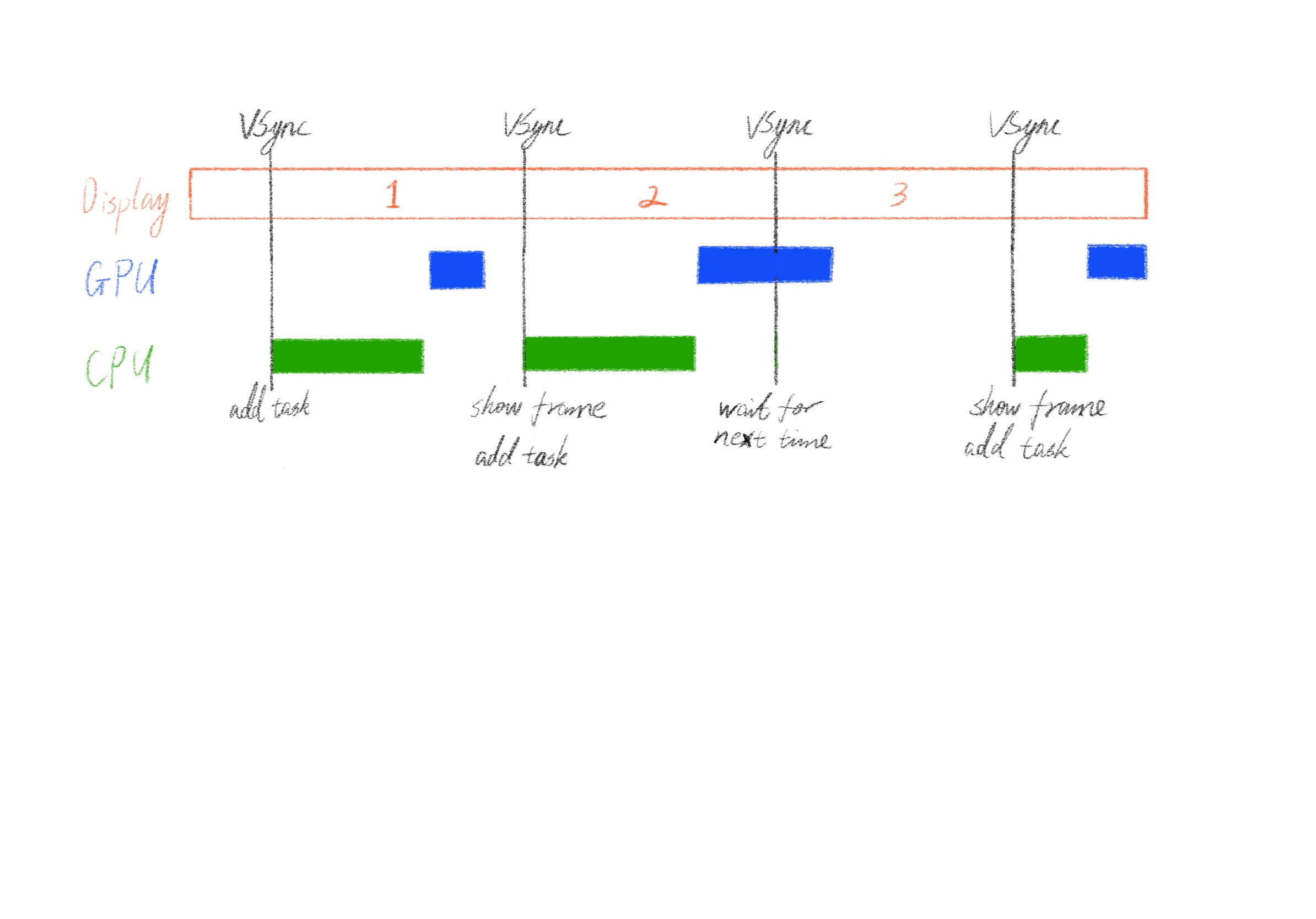 In short, whatever the CPU or the GPU, both of them spend too much time more than the interval between two VSync, the display will stuck. Thus, the application have to reduce resource consumption of the CPU and the GPU.