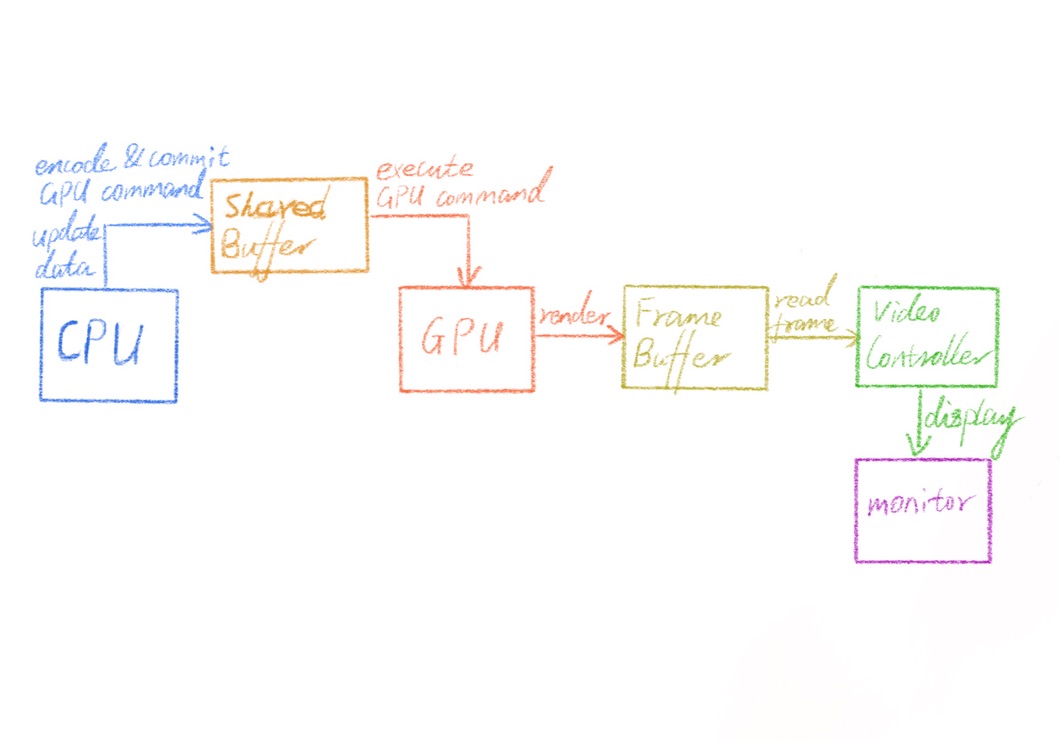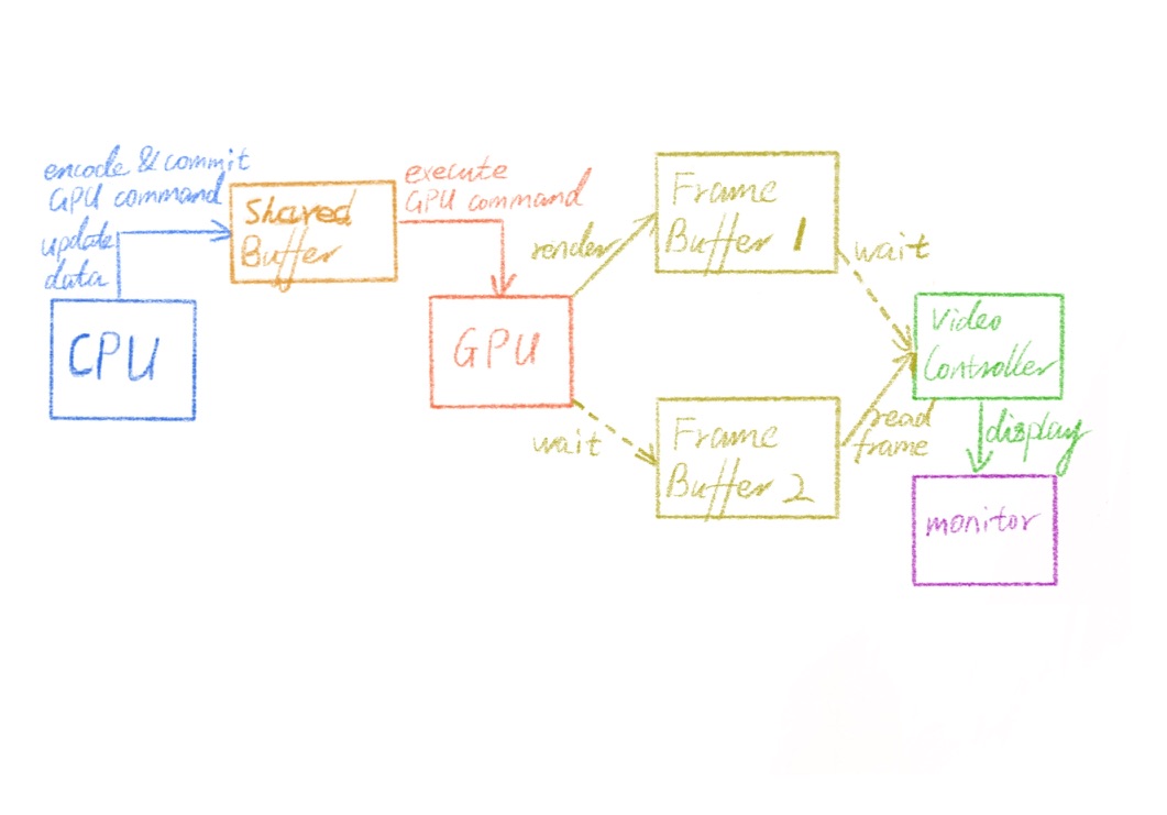 So, the CPU and the GPU need to cooperate together during a frame rendering. The CPU prepares and initialises frame data, and then write them into a shared buffer that provide for the GPU to read and shader. About synchronising the CPU and the GPU work in iOS, you can reference Apple’s documentation: synchronizing_cpu_and_gpu_work