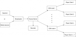 The process of live video streaming: The broadcaster (smart phone, OBS or other device) puts streaming from caputure or media resource to source server in Real-Time Messaging Protocol (RTMP) .